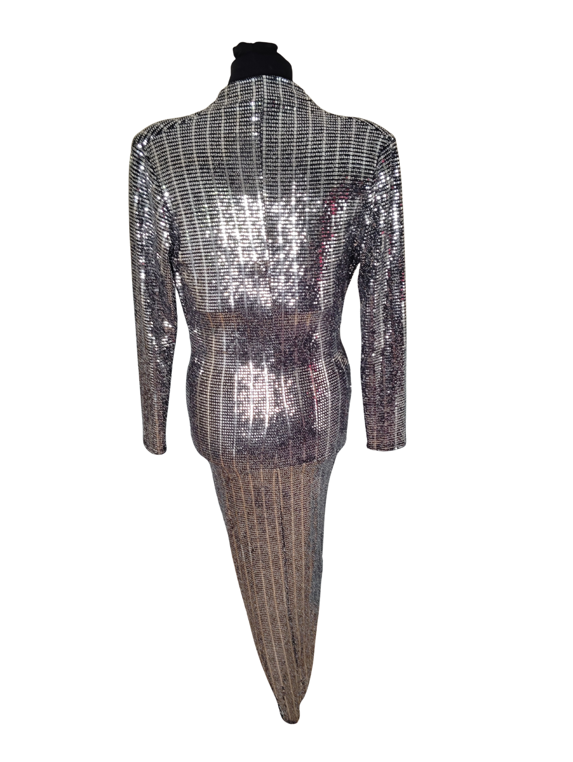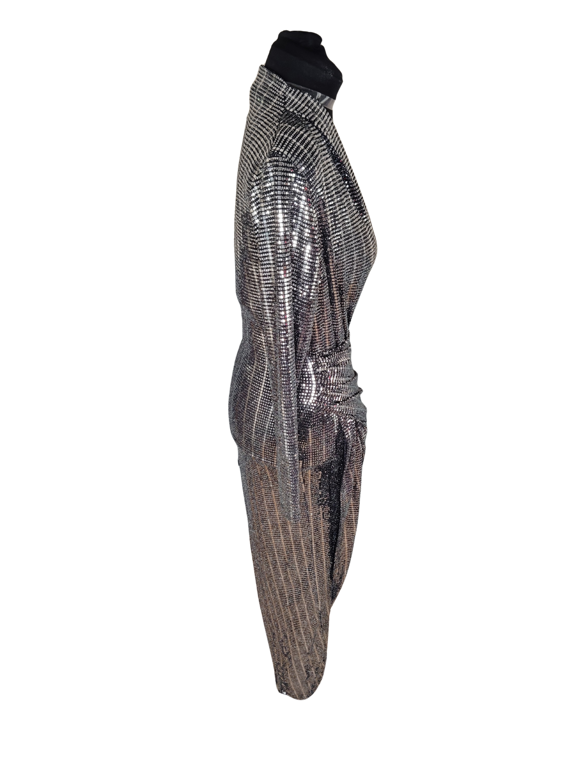 Description: A Show Stopper of a Dress, still with tags. Padded shoulders, and wrap neckline. Waist has ruced area to one side and high split to the other side to the thigh. There is a small amount of stretch, but not a huge amount.
