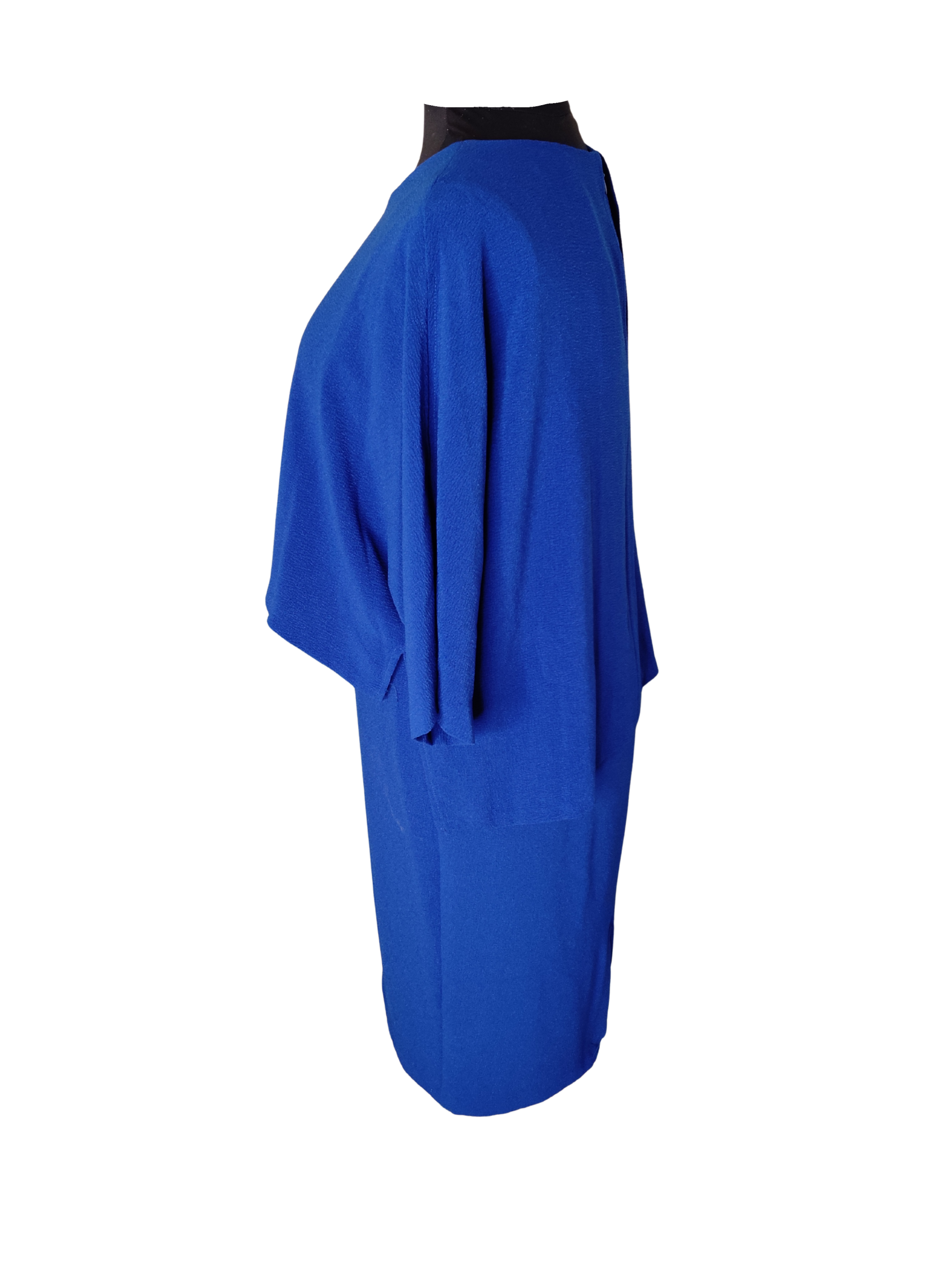 Description: A very stylish quality dress new with tags. Plain colbat blue with cape style top and shift effect dress. 3/4 length sleeves with a slit detail.