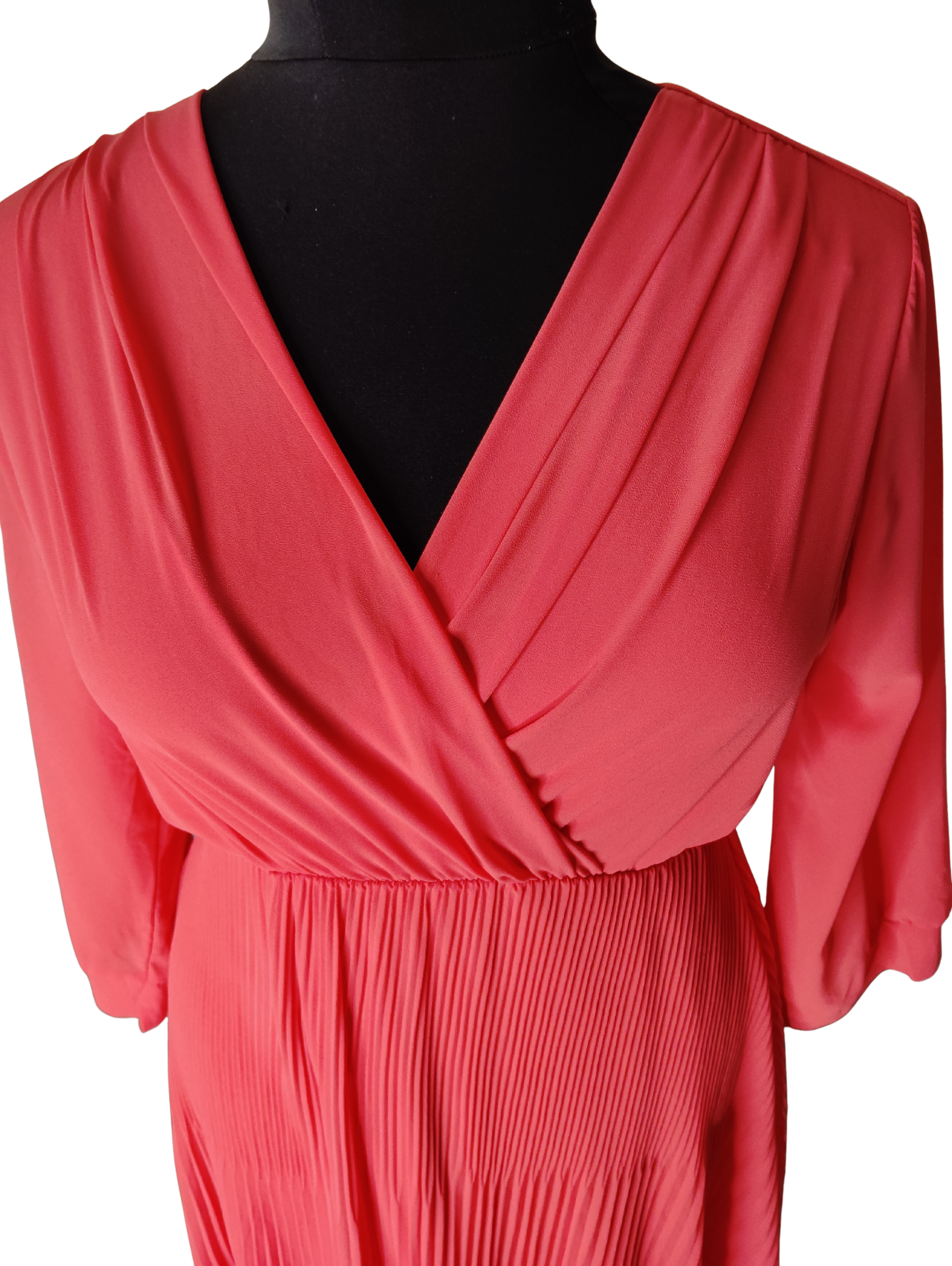 Orange pleated skirt dress with cross-over bodice.